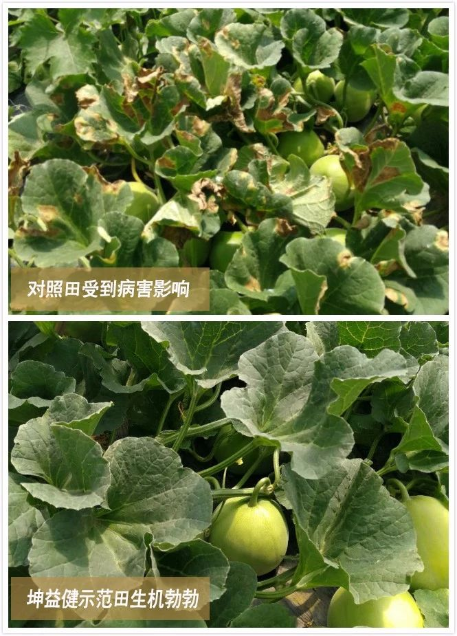 使用效果: 使用坤益健菌劑后,土壤無(wú)板結(jié)硬塊,甜瓜主根粗壯,分布均勻,毛細(xì)根多,PH值由4.5升至5.2,葉片大,濃綠,果型均勻,糖度到13%(產(chǎn)區(qū)內(nèi)“田寶”正常糖度為11-12%),試驗(yàn)設(shè)的對(duì)照棚因大部分早衰死棵,村鄰的還有沒收獲的,病害早衰嚴(yán)重。